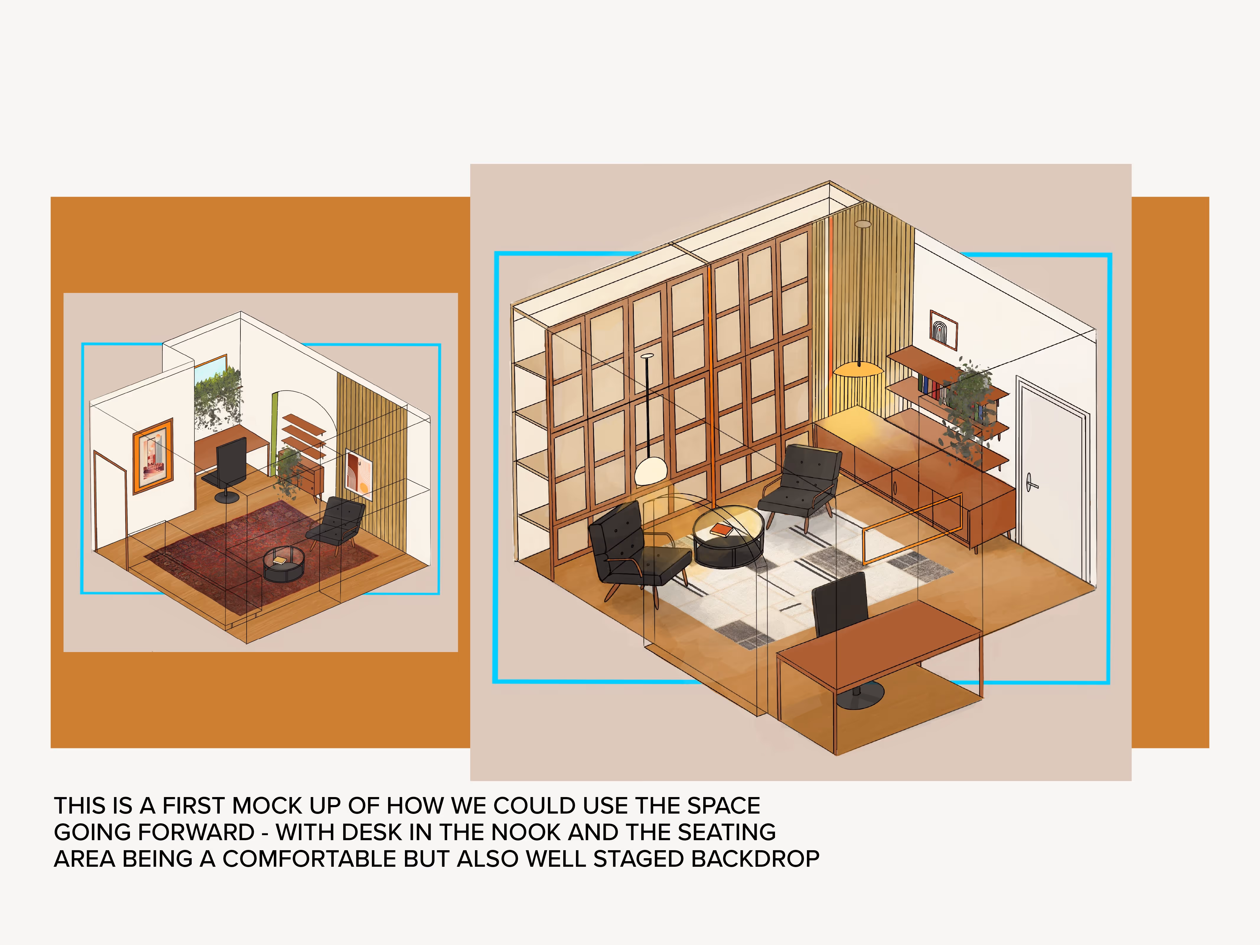 We ended up pursuing a design that will deliver a space that is a complete step away from a typical branded office. Utilising a warm/soft palette including orange (in contrast to our company's light blue), the decor has a vintage theme. With comfortable furniture and vintage rug, this space serves many purposes - somewhere for staff to eat lunch away from their desk, read an article away from the main office or undertake detailed work/studying in a quiet space; there is a desk set up for a dedicated area of focus.