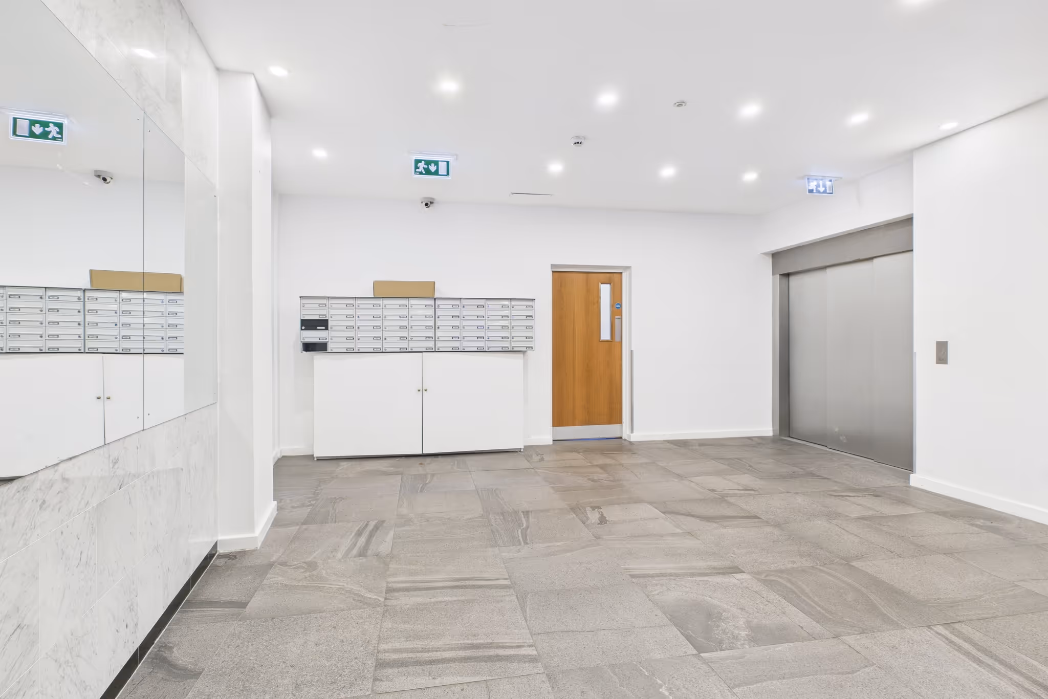 Positioned on the second floor and accessible via an extra-large lift, the flat features high ceilings and classic Crittall windows that flood the interiors with natural light. Wooden flooring runs throughout, complemented by brand new plush carpet in one of the generously sized double bedrooms. Both bedrooms are large (one particularly so), while additional built-in hallway wardrobes provide ample storage.