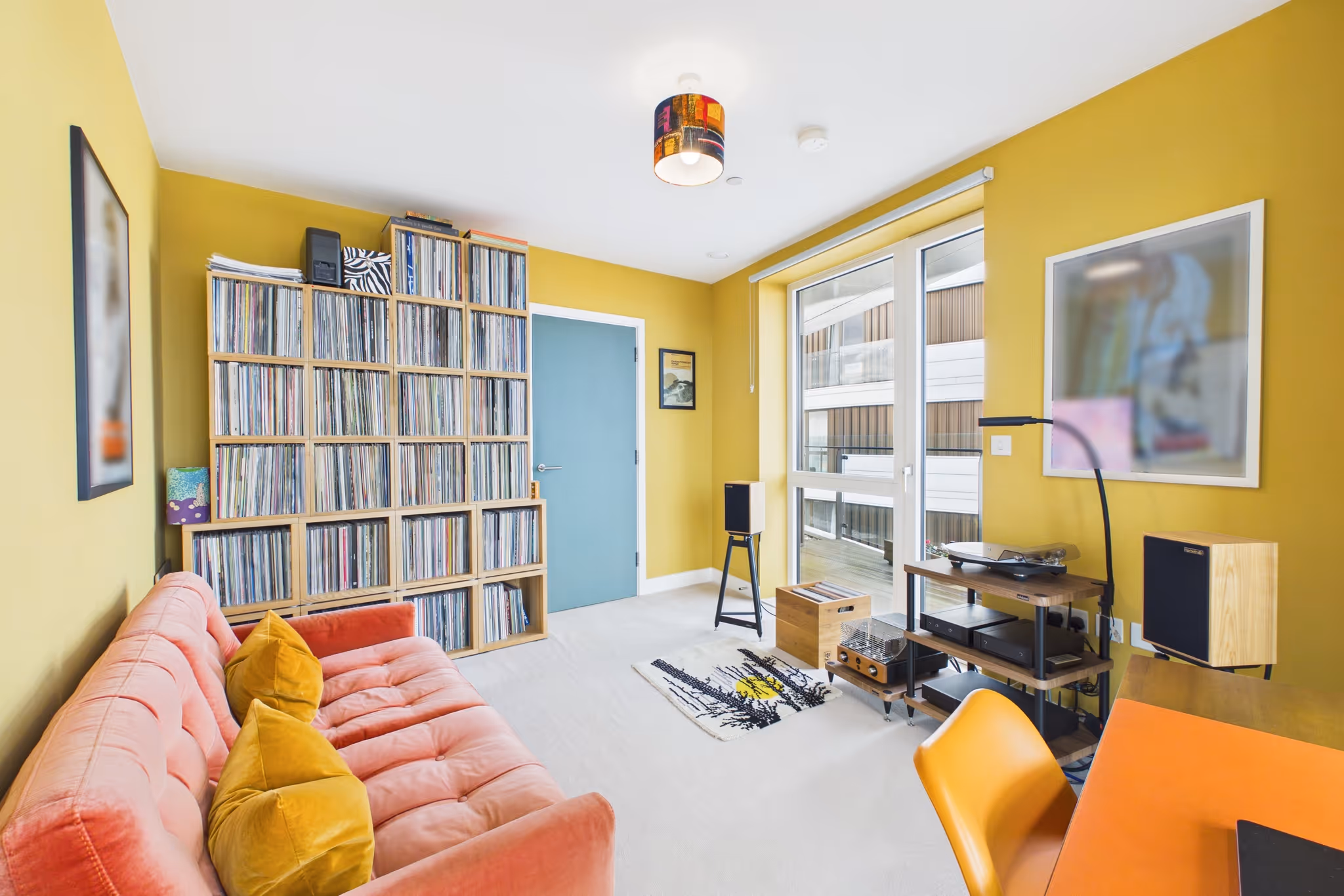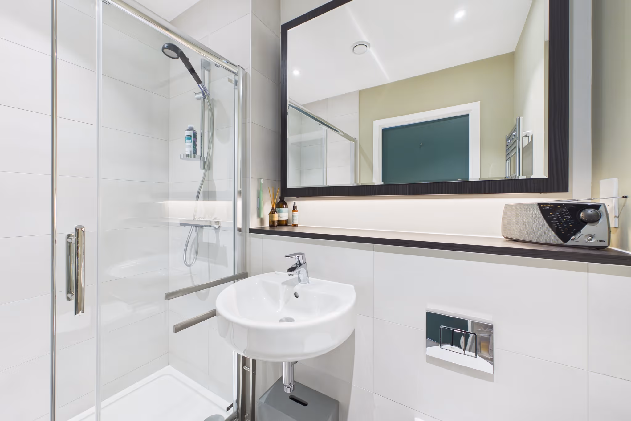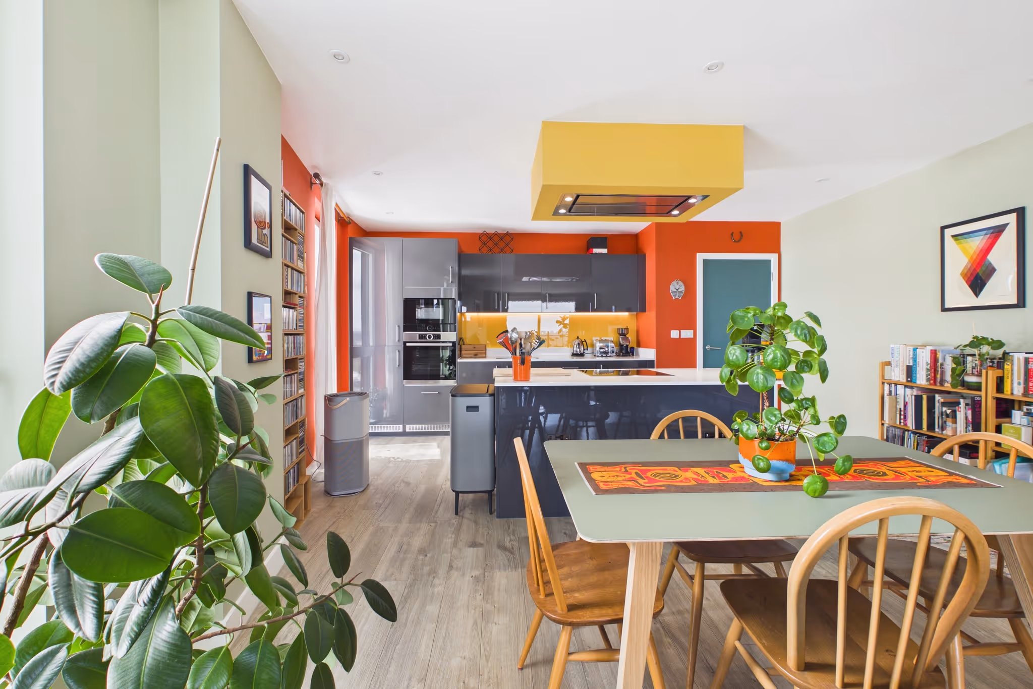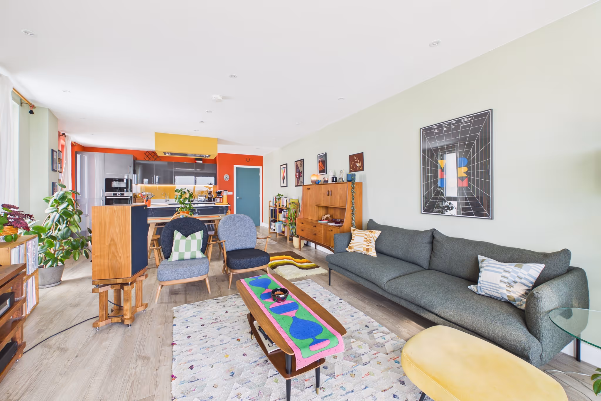 Inside, the layout is smart and well thought-out. The principal bedroom has its own en suite shower room and a dedicated walk-in wardrobe area; the second bedroom is bright and a solid size with built-in storage. Wood flooring runs through the living spaces, carpet in the bedrooms, and the colour scheme - sage green hallways and reception, burnt orange kitchen, yellow in the principal bedroom - gives the place a real personality.