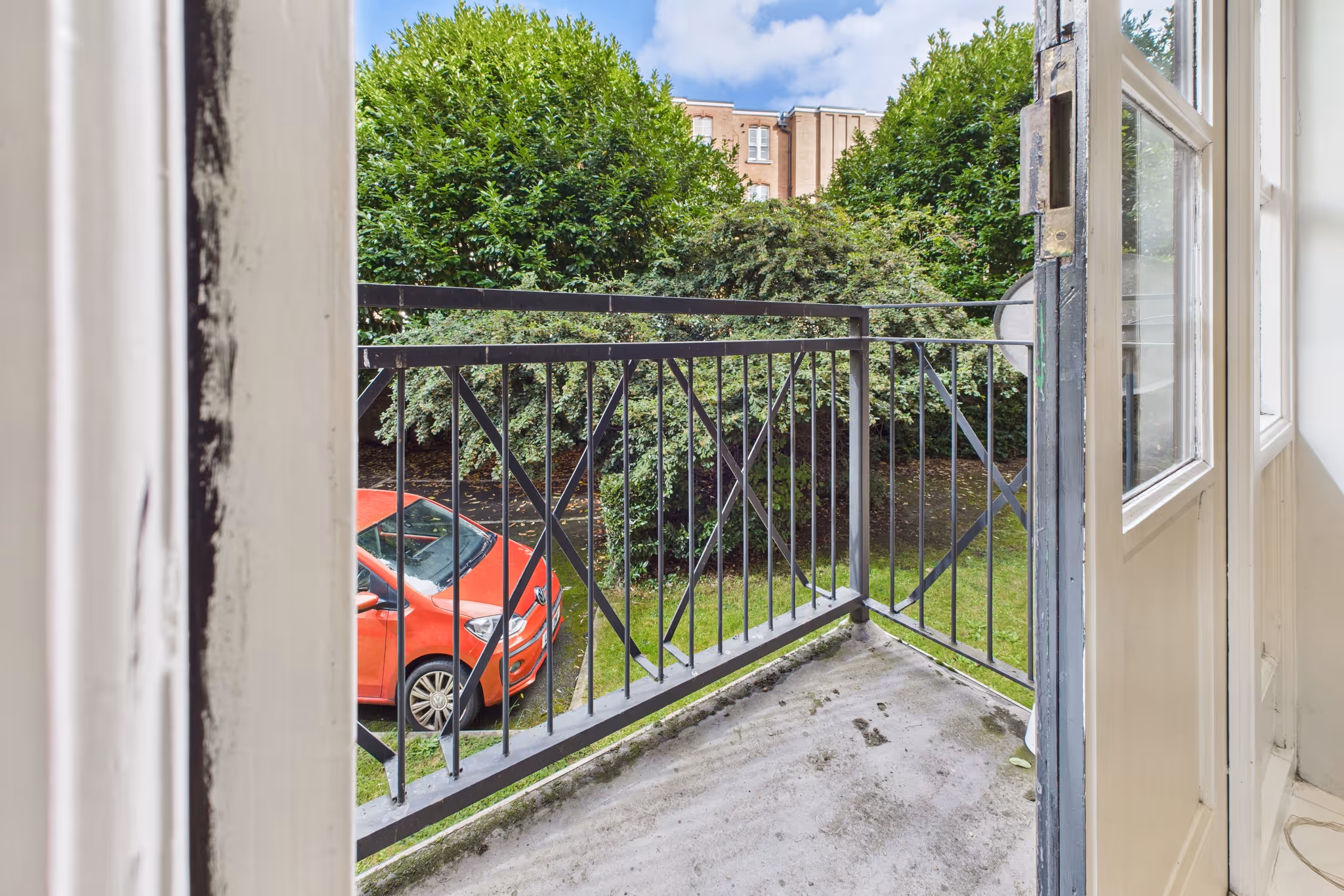 Step inside and you’re greeted by a bright, roomy hallway that sets the tone. The large open-plan reception is the heart of the home - think warm wood floors, loads of light, and a sleek corner kitchen with a breakfast bar, funky monochrome splashback and black tiled floors. Open the balcony door to your private rear-facing balcony, perfect for morning coffee, evening drinks or a jungle of plants, with leafy views and peace away from the road.