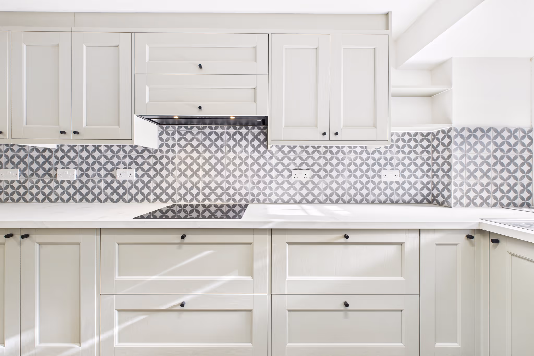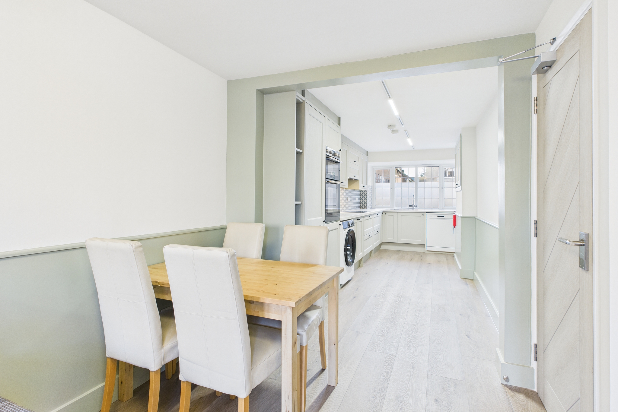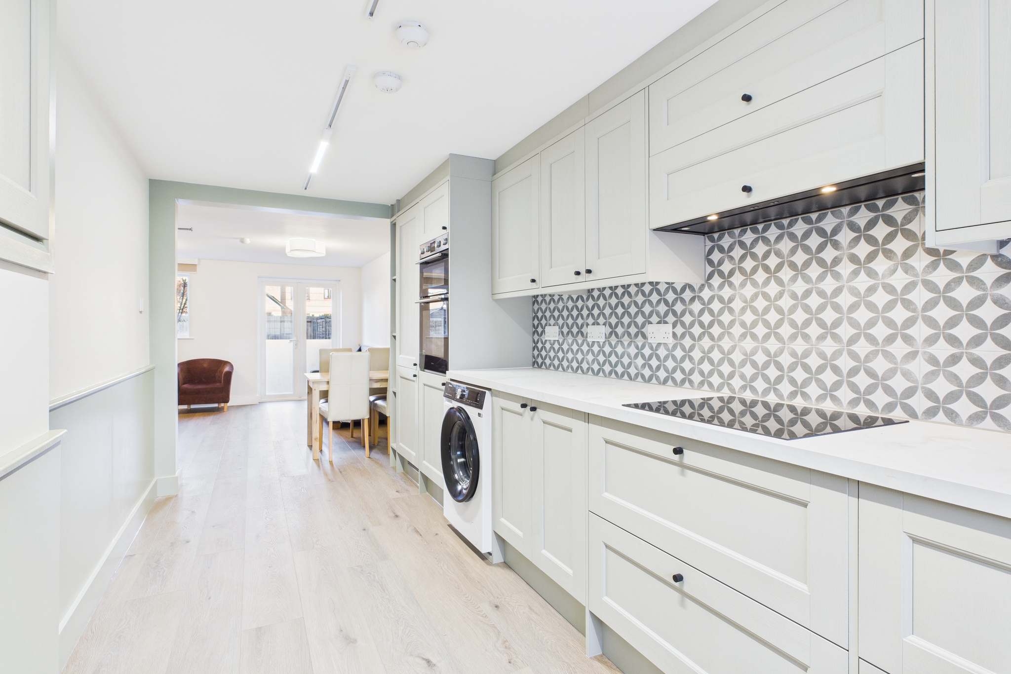 The ground floor features a modern open-plan layout, with the kitchen smartly relocated to the front of the property. Finished with stylish splashback tiling and quality fittings, it flows naturally into the spacious living and dining area that opens onto the north-facing private garden—a generous, mainly paved outdoor space perfect for dining or relaxation.