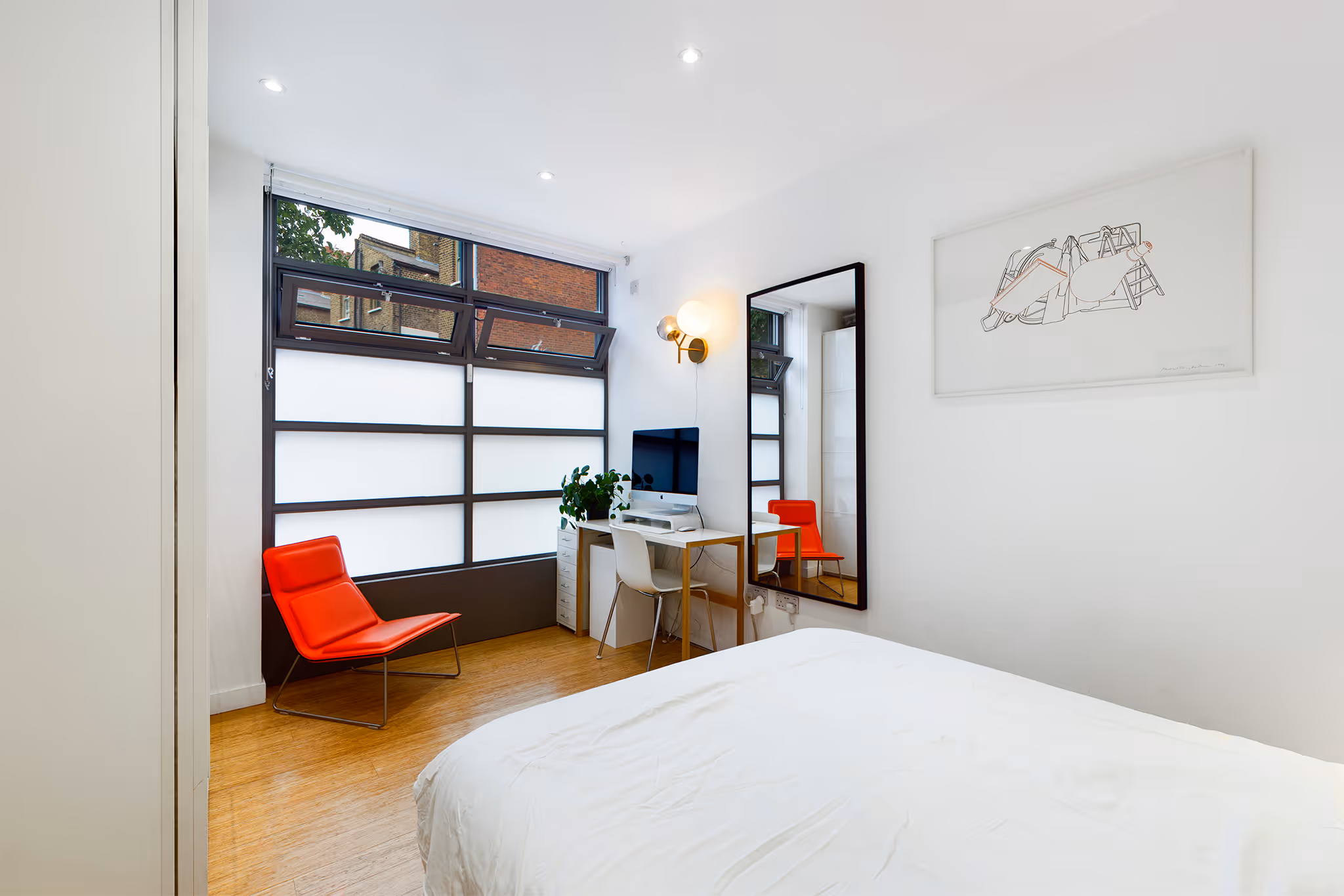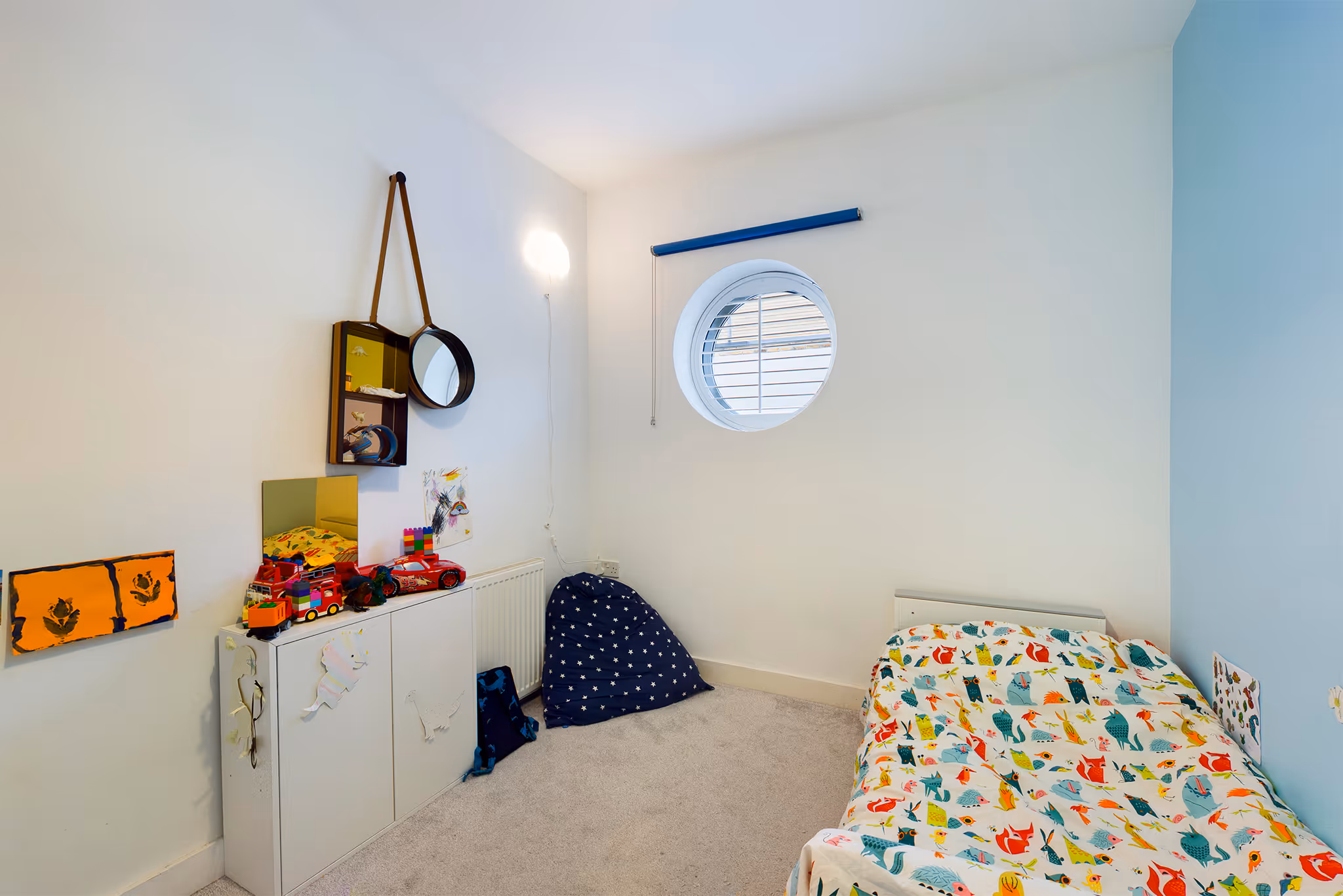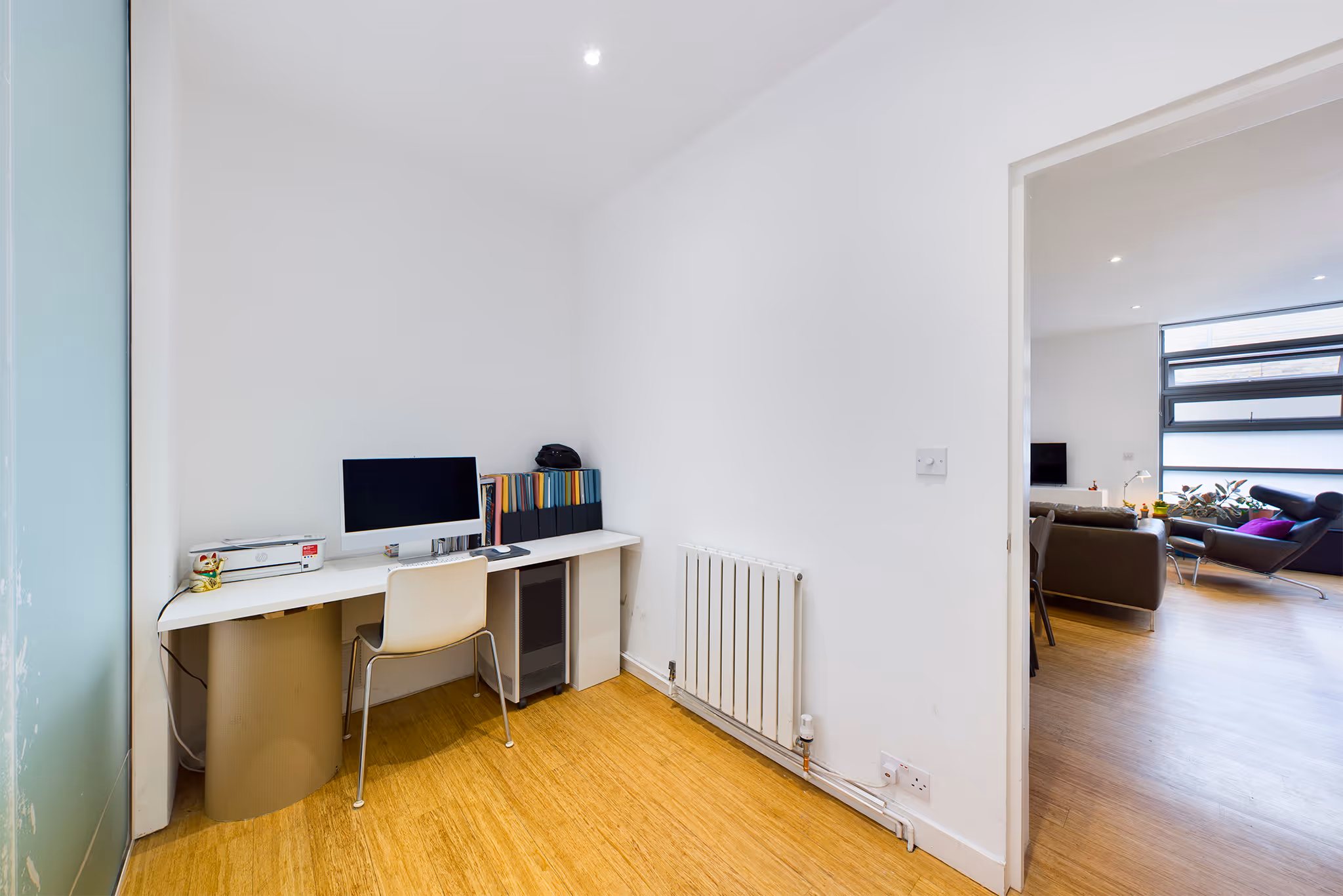 This two bed apartment is on the ground floor, but with its entrance accessed via the gated car park to the rear of the building, it retains plenty of privacy from the outside world. It is bright and cosy, with an open plan living-dining-kitchen area, off which you will find the remaining rooms. There is a double bedroom by the kitchen, next to the modern family bathroom. At the other end of the flat, through a door is a study room, which bridges the main bedroom and the living area together.