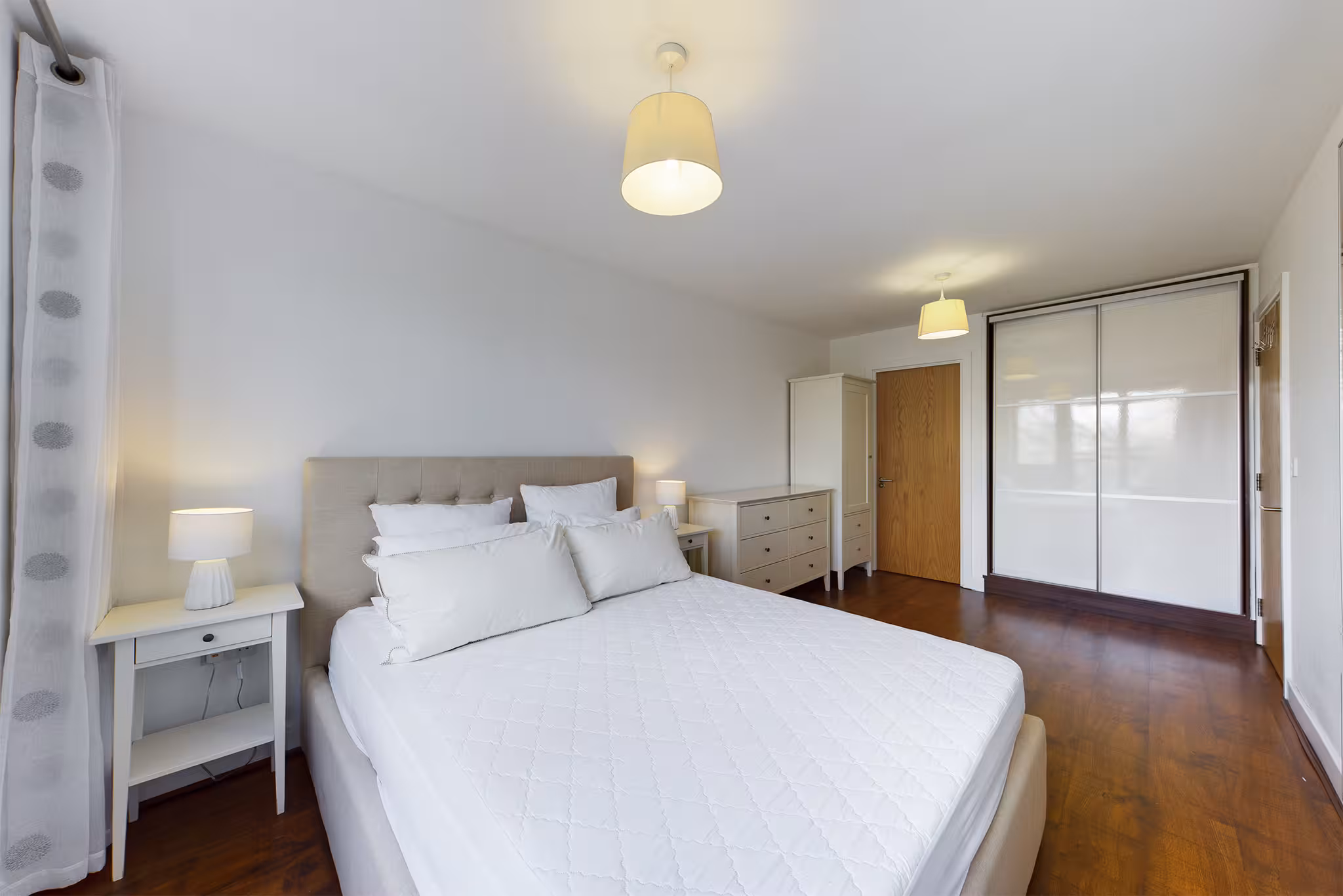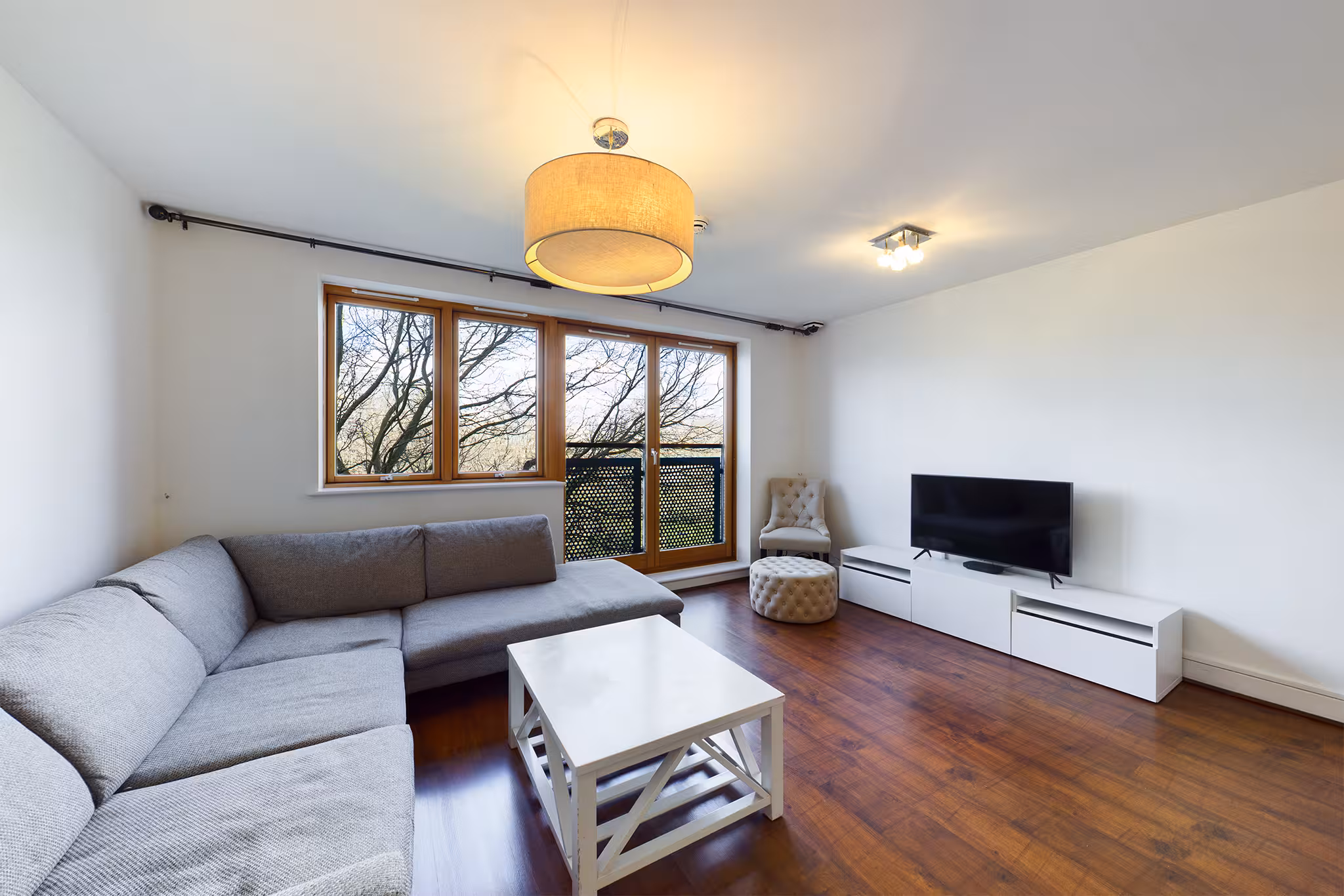 Located in Rathnew Court, this stylish flat is available again following the end of a long-term tenancy. Recently renovated to a high standard, it features dark wooden flooring throughout and a tasteful, neutral paint finish. The property offers a large open-plan living and kitchen area with double doors opening onto a Juliet balcony overlooking Meath Gardens, a generous master bedroom with en suite, a bright family bathroom with a full-size bath, and a second bedroom that could serve as a study or walk-in wardrobe.