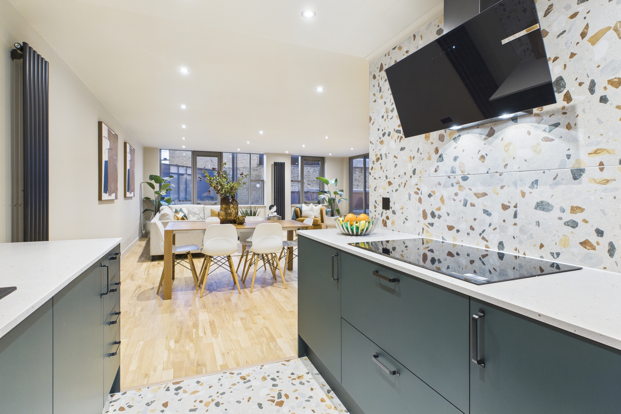The brand-new kitchen brings a modern Shoreditch softness - concrete-colour quartz worktops, a beautiful green finish, terrazzo tiling up to the ceiling, and a full suite of high-quality appliances. It’s both a workspace and a centrepiece.