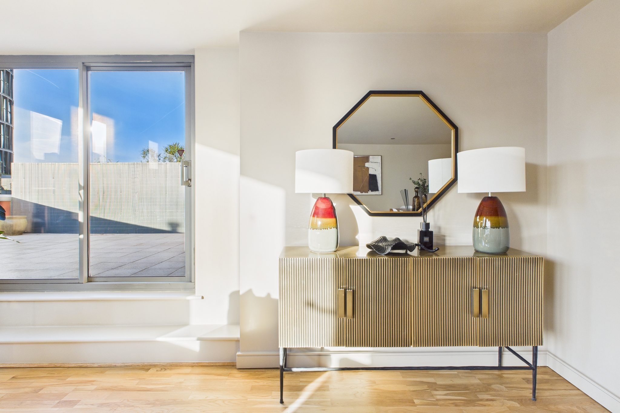 The reception space is the showstopper here - over 525 square feet of open-plan living and kitchen, wrapped in natural light thanks to full-width windows that lead out to the sweeping west-facing terrace. It’s a room you immediately sink into - generous, airy, and perfect for long dinners, quiet mornings, or late evenings watching the sun drop behind the Shoreditch skyline.