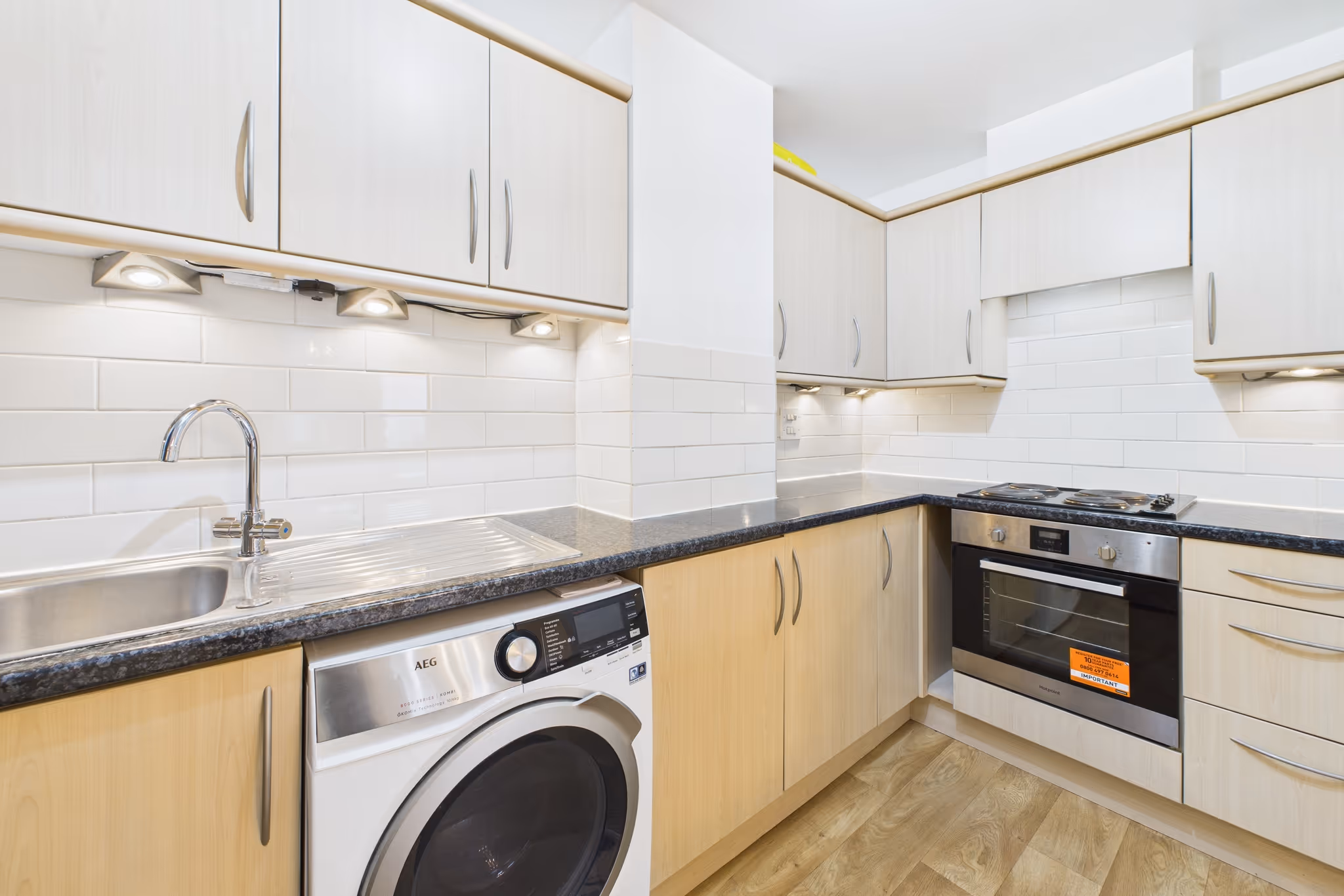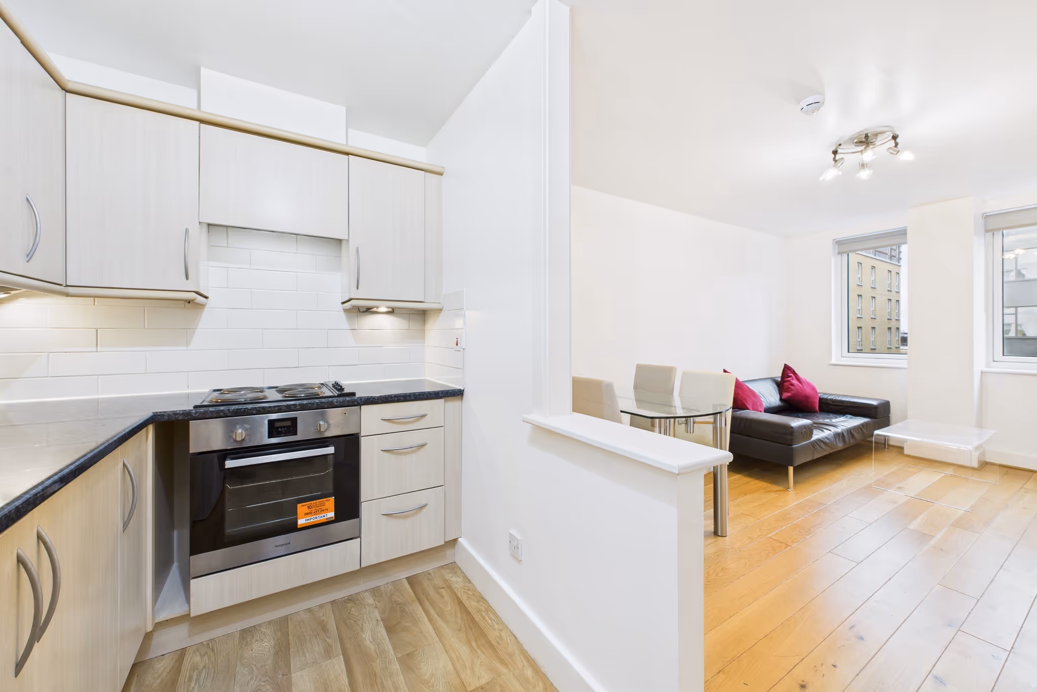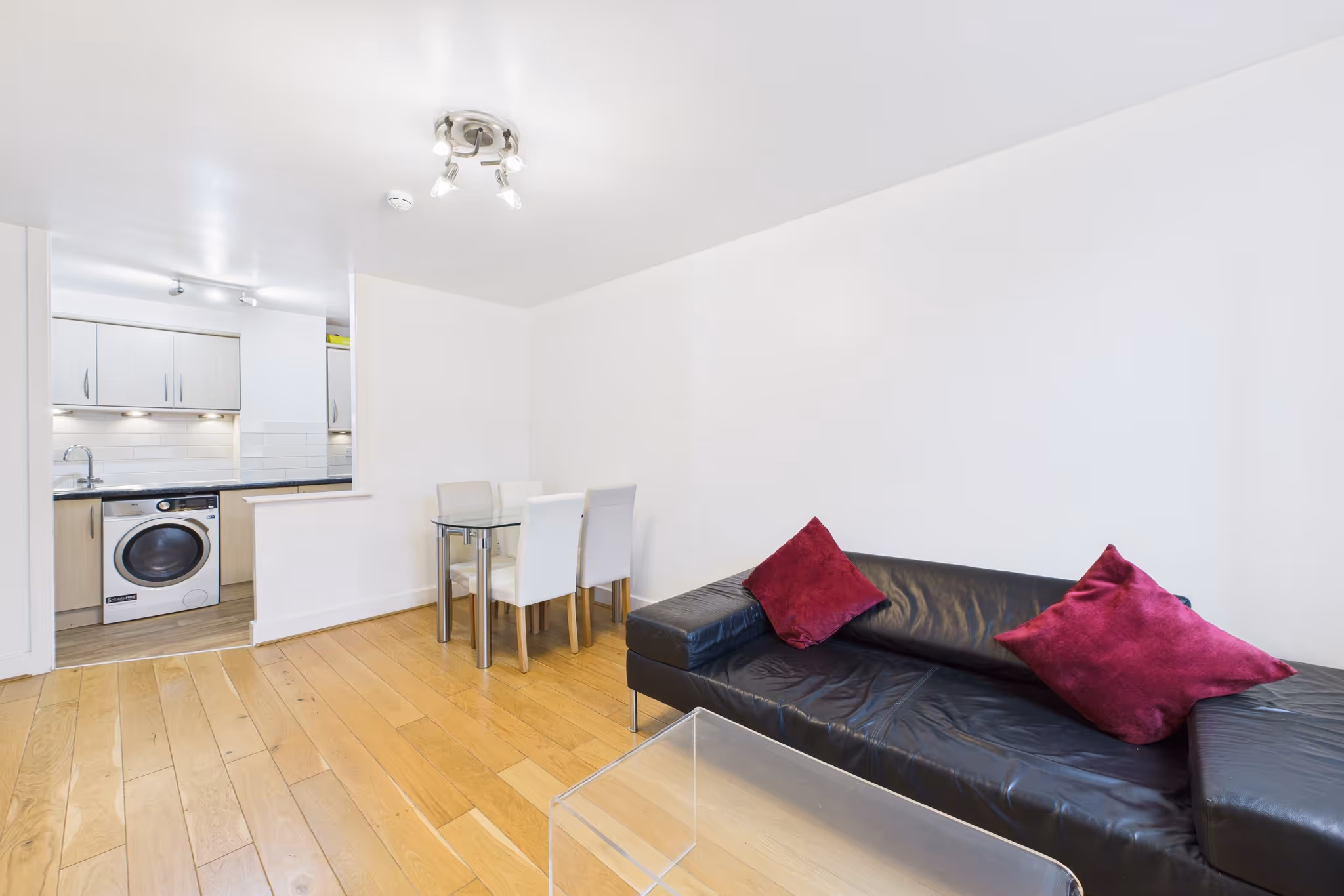 The property features wood flooring throughout and a bright open-plan living and kitchen area, ideal for relaxed entertaining or remote work. The kitchen is fitted with contemporary units and integrated appliances, offering everything needed for comfortable day-to-day living.